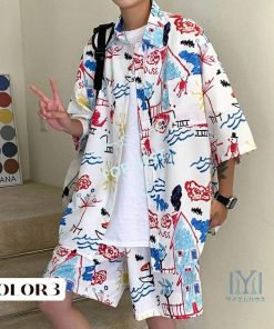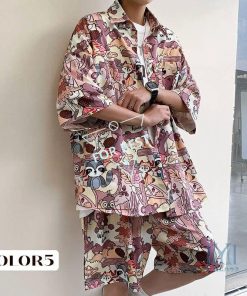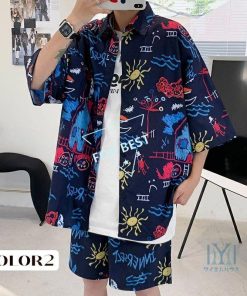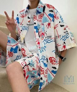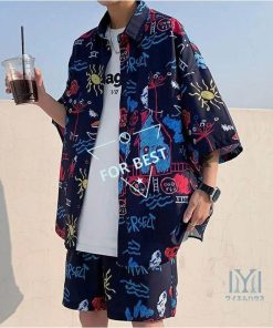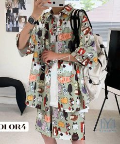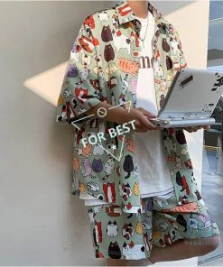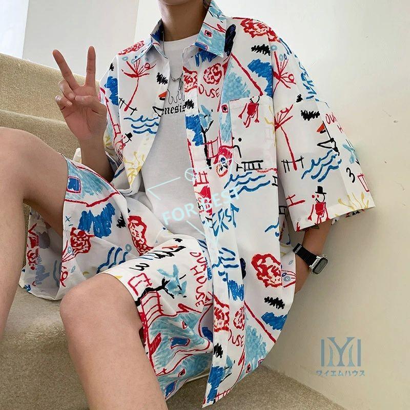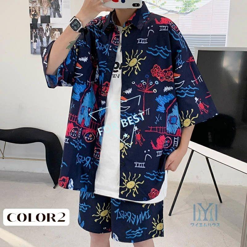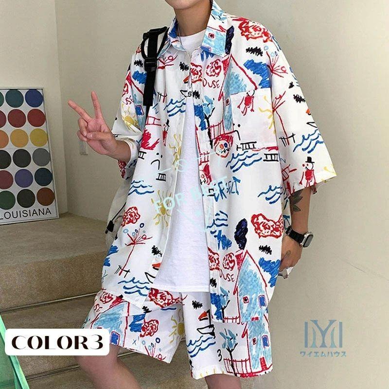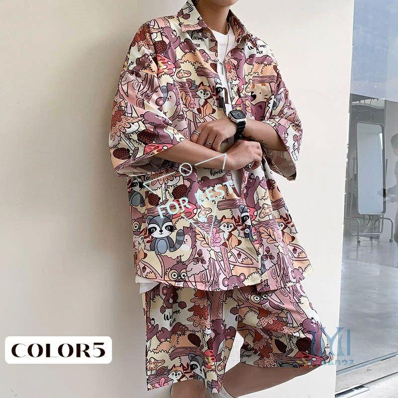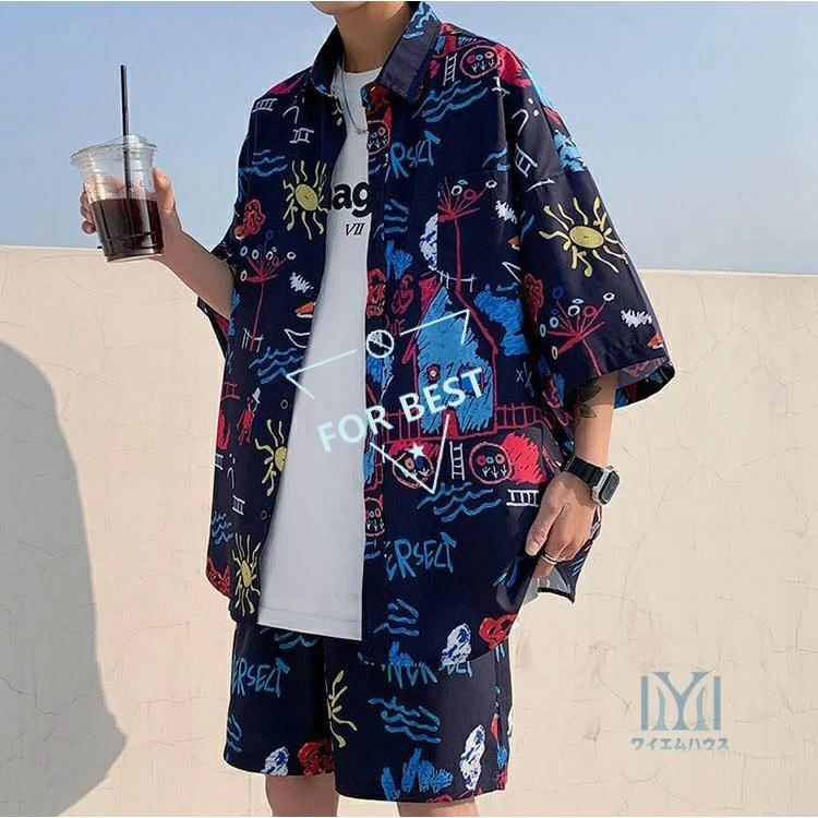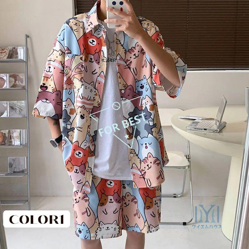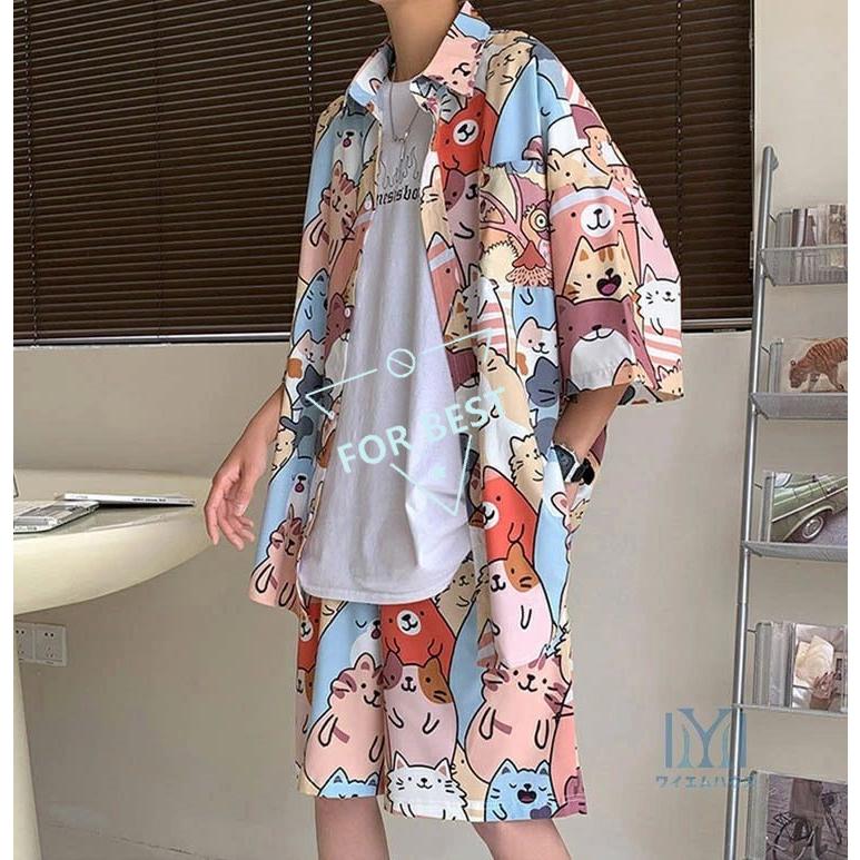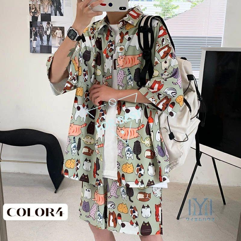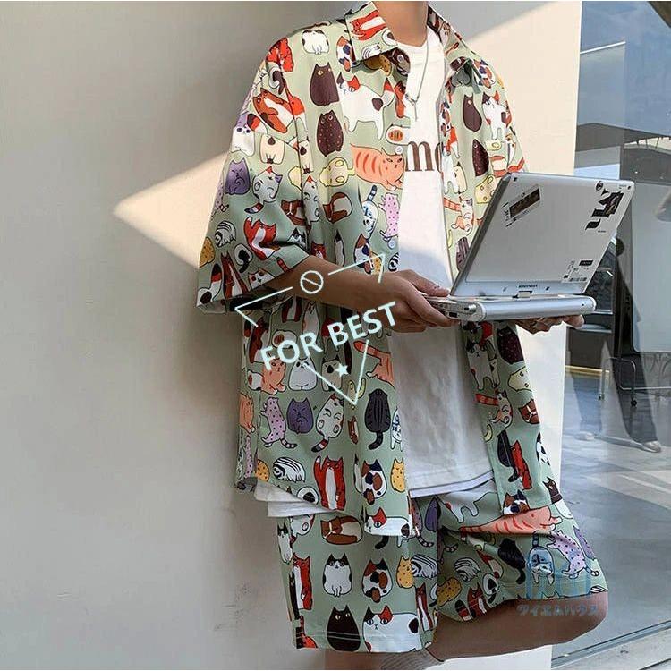 セットアップ メンズ ジャージ 上下セット 夏物 柄物 猫柄 半袖シャツ 前開き ハーフパンツ カジュアルセット 涼しい ハワイ風 メンズファション おしゃれ お兄系