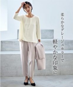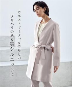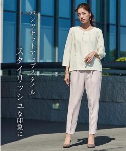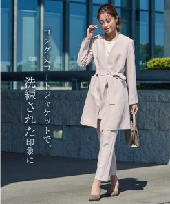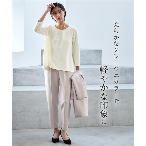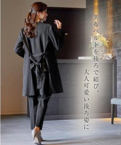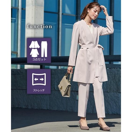 【素材】品質=[表地]<ジャケット>ポリエステル93%・ポリウレタン7% <ブラウス>ポリエステル93%・ポリウレタン7% <パンツ>ポリエステル93%・ポリウレタン7%【裏地】有(ジャケット:総裏 ブラウス・パンツ:無) ジャケット:前マグネットボタン開 ポケット前2 ブラウス:後涙ボタン開 パンツ:ファスナー無 ウエスト脇・後ゴム入 ポケット両脇共布ベルト付 ※この商品は3点同サイズのみで販売します。※ベルトは取り外しできます。