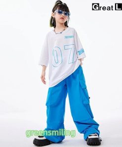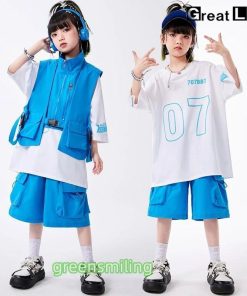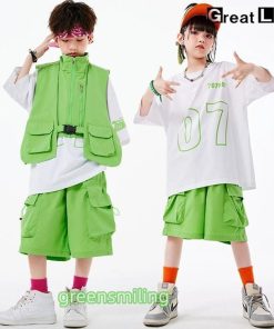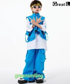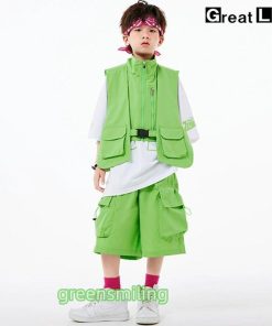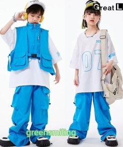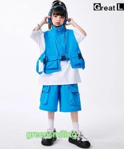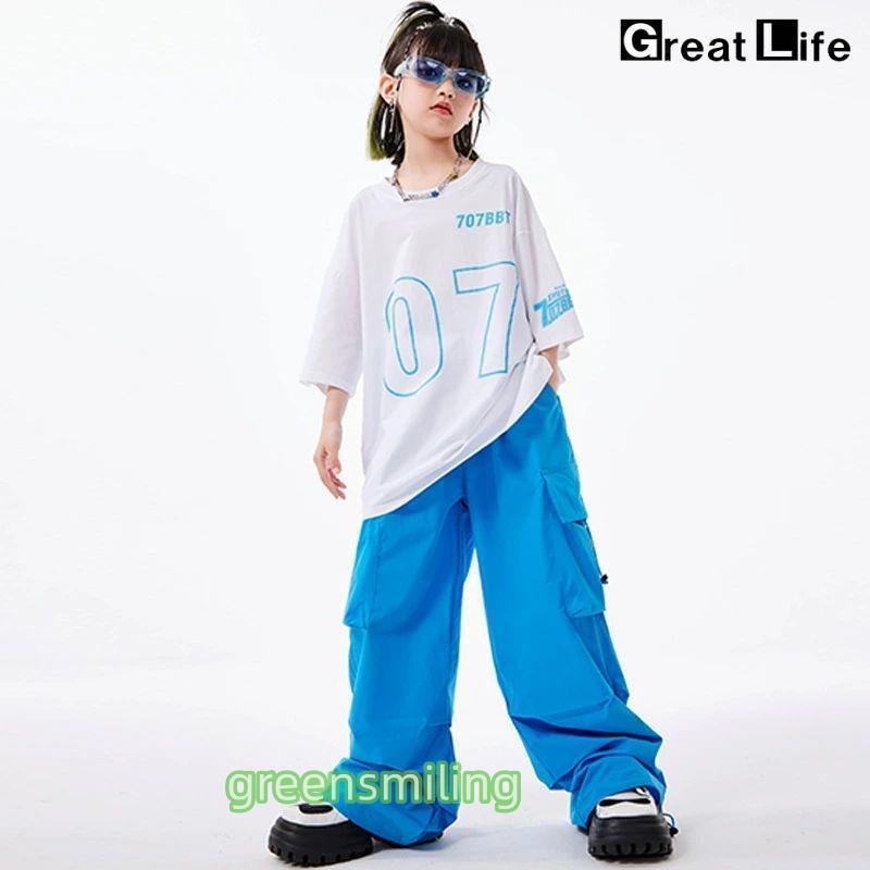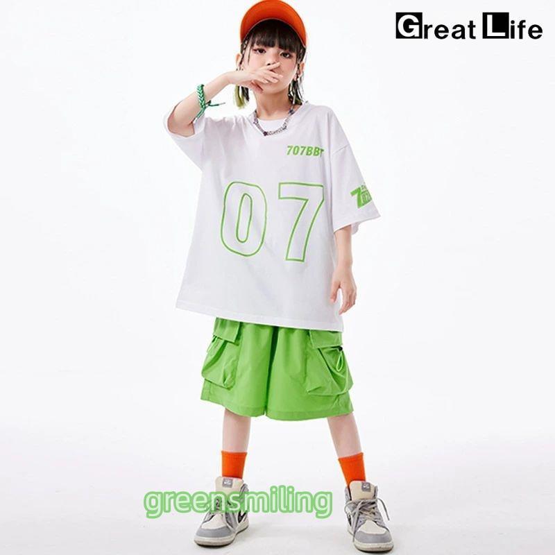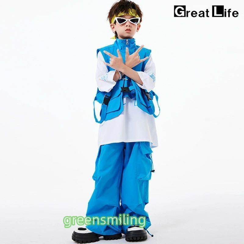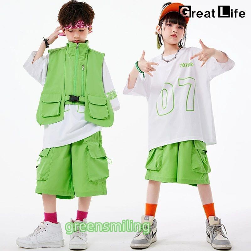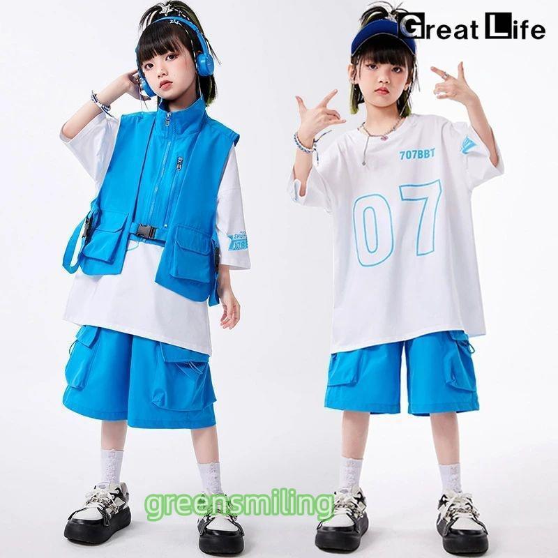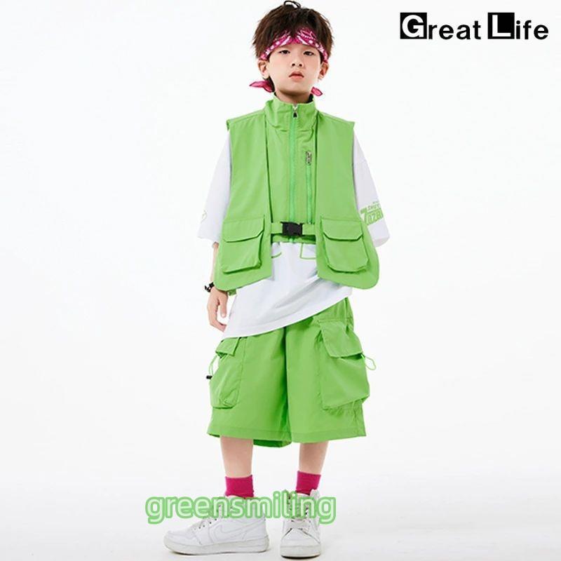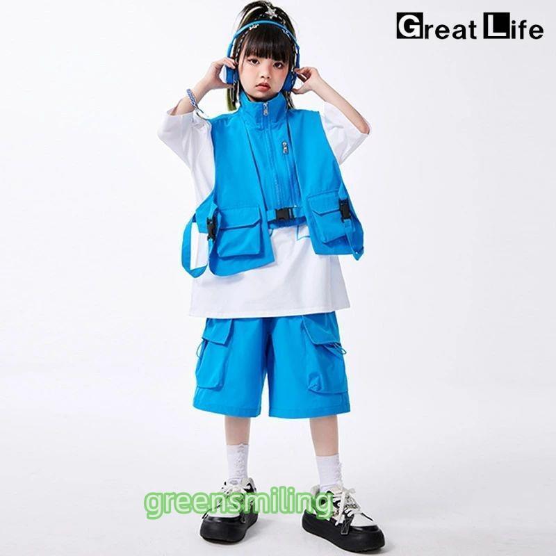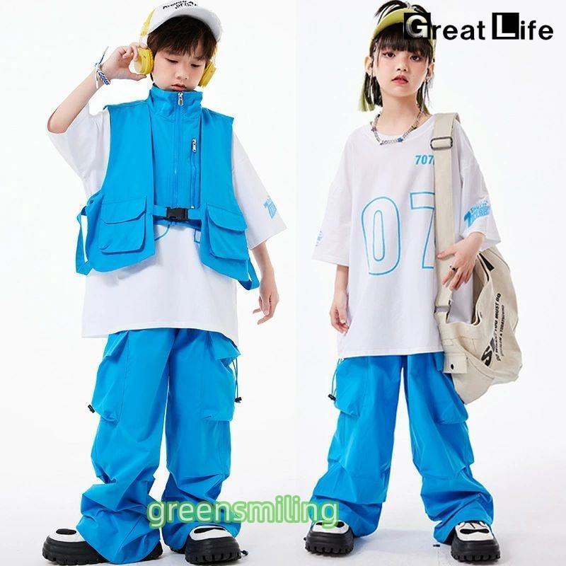 ブルー グリーン キッズ ダンス衣装 セットアップ 半袖 Tシャツ ベスト ハーフパンツ 半ズボン ロングパンツ カーゴパンツ HIPHOP 女の子 男の子 子供服 ゆった