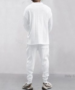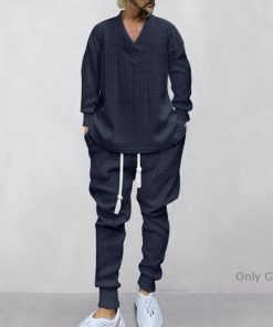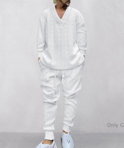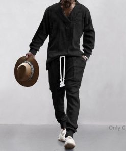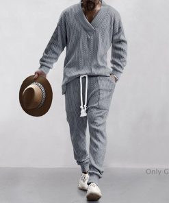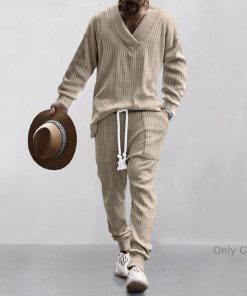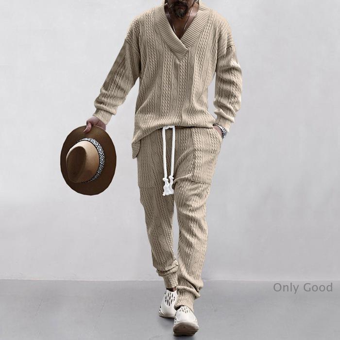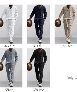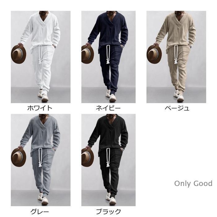 上下セット メンズ 秋 冬 セットアップ ニット ジャガード ルームウエア 無地 長袖 Vネック ロング丈 ロングパンツ ウエスト
