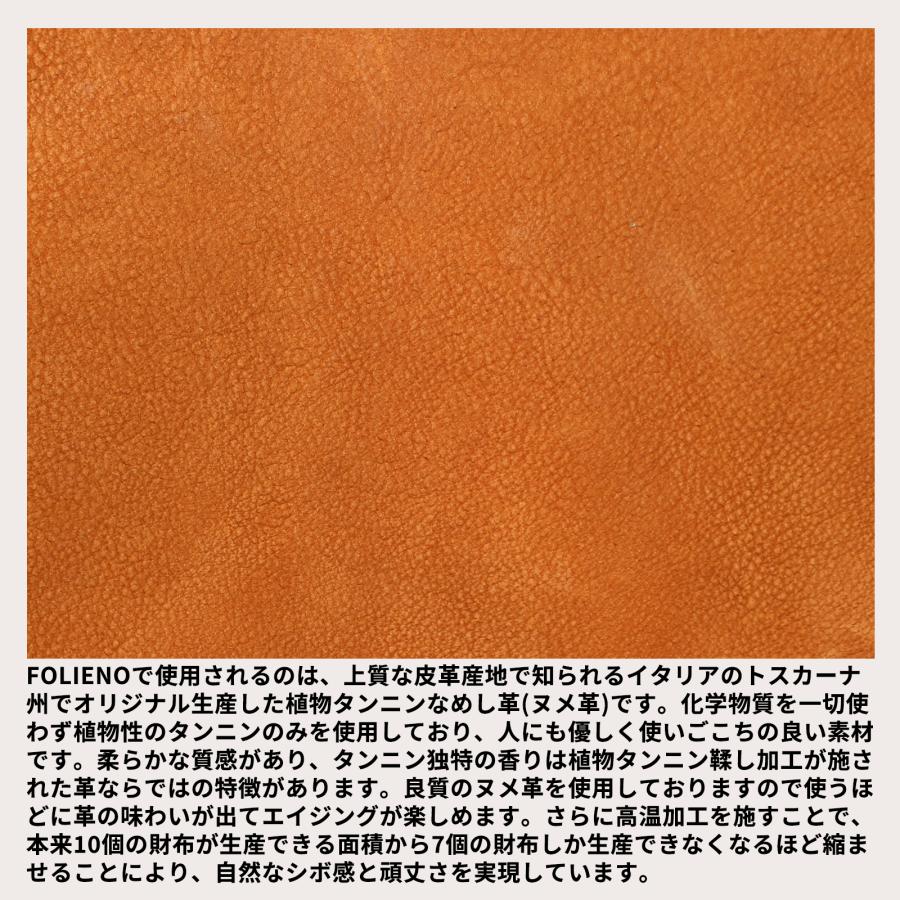 ● 【イタリア製高級ヌメ革】 Folieno(フォリエノ)で使用されるのは、上質な皮革産地で知られるイタリアのトスカーナ州でオリジナル生産した植物タンニンなめし革(ヌメ革)です。化学物質を一切使わず植物性のタンニンのみを使用しており、人にも優しく使いごこちの良い素材です。