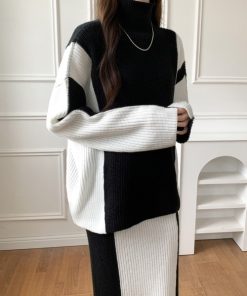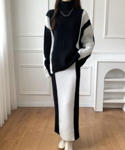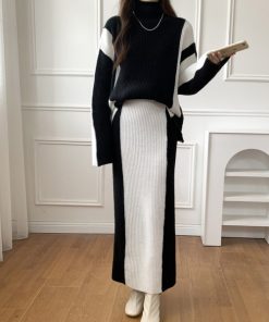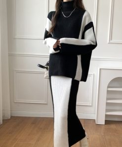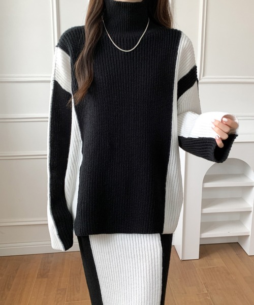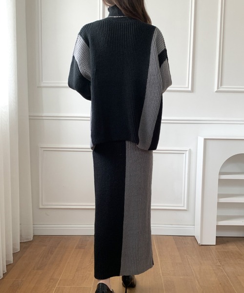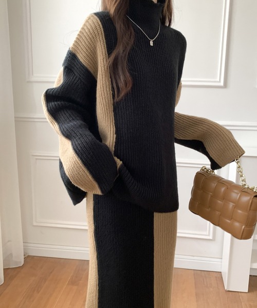 参考商品名:リラックスバイカラータートルネック長袖プルオーバー&スカートセットアップ
