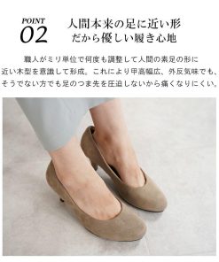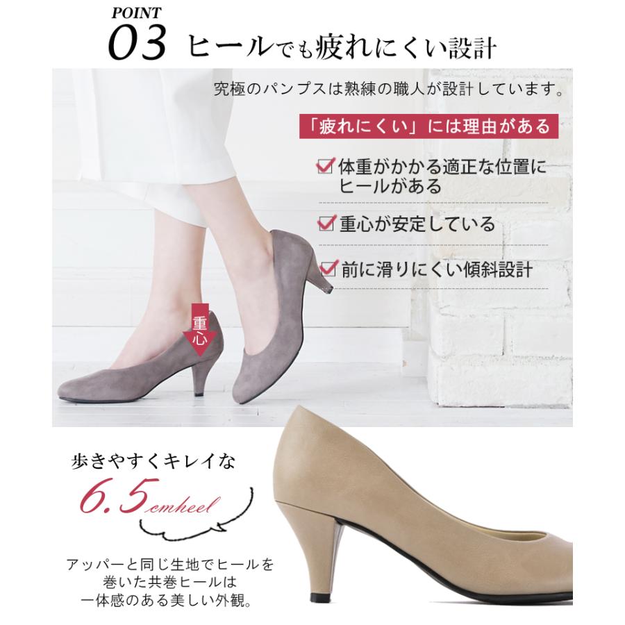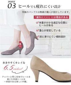 【詳細】ヒール高:6.5cm / つま先:ラウンドトゥ / 甲幅:約8.0cm/ 甲外周り:約14.5cm / 素材:合成皮革 / 片足重さ:204g / クッション中敷・美脚ヒール・ノンスリップソール・同色共巻ヒール・甲高幅広 対応