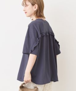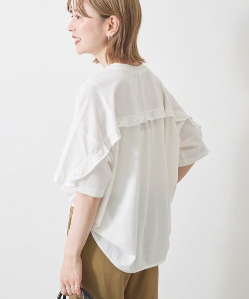 キーワード:tシャツ レディース クルーネック フリル 半袖 無地 アウトドア ドライブ プチプラ ベーシック 夏 公園 大人カジュアル