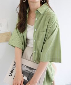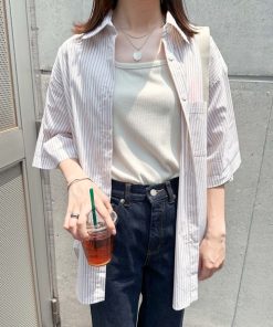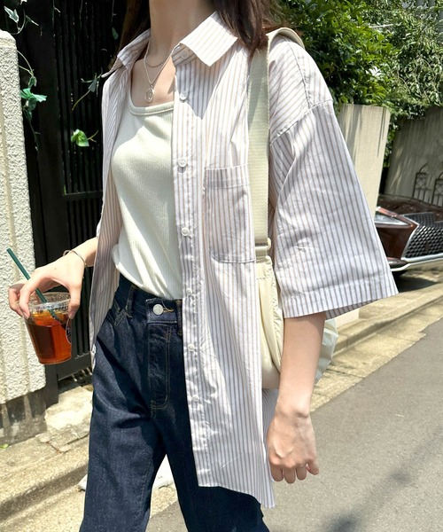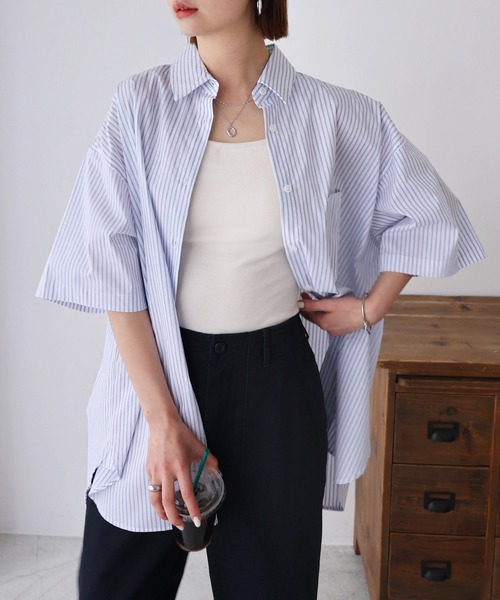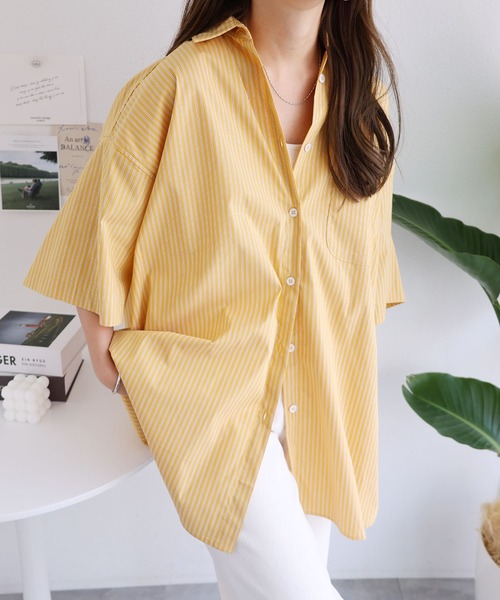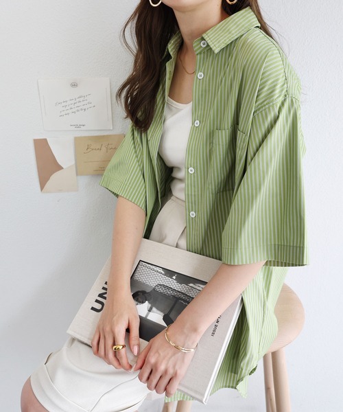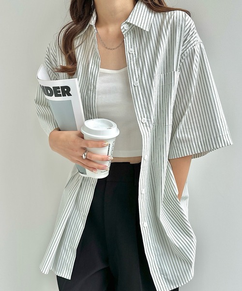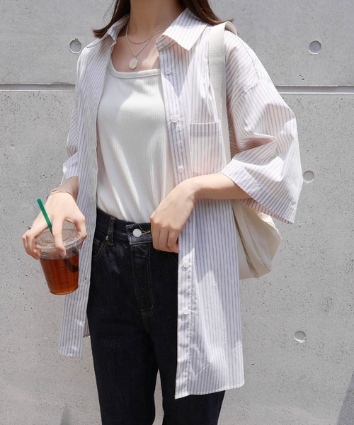 キーワード:ブラウス シャツ レディース ストライプ レギュラーカラー ロング丈 半袖 夏 春