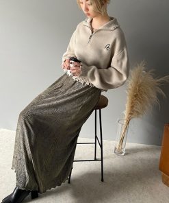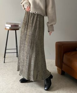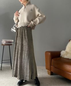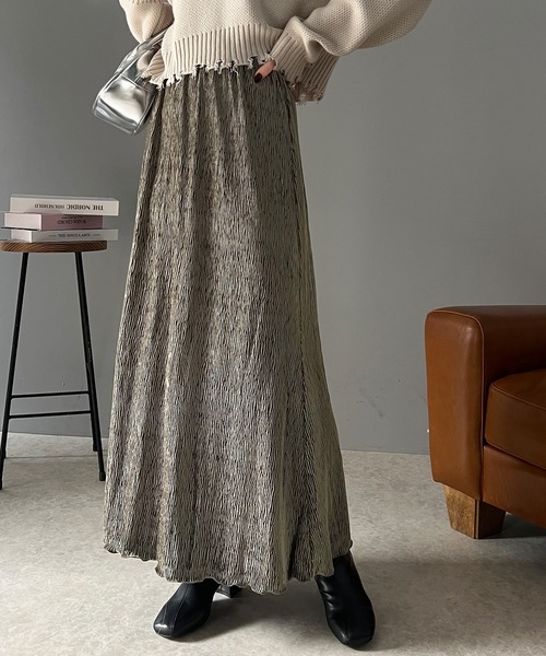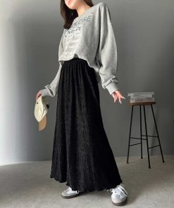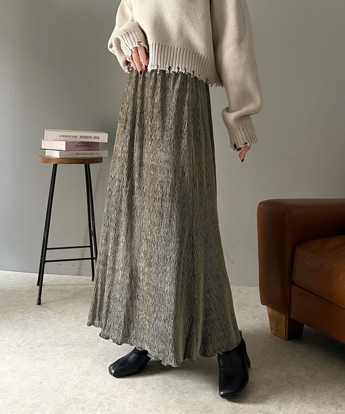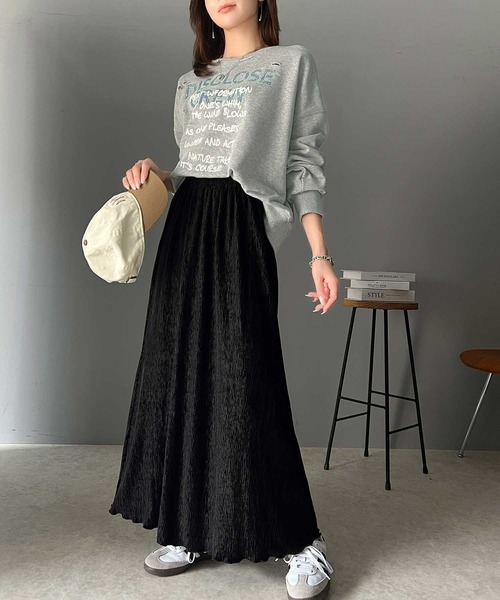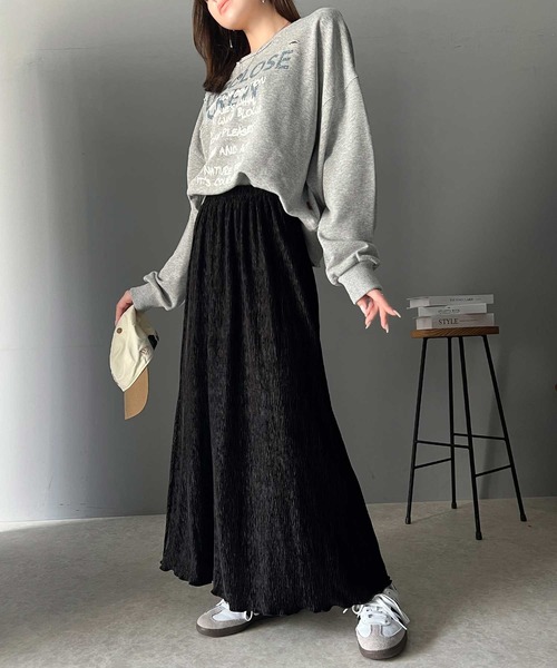 参考商品名:光沢感と揺れが美しい、簡単に着こなしスタイル。シャイニーベロアナロースカート