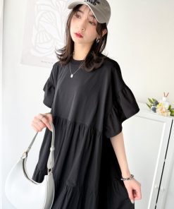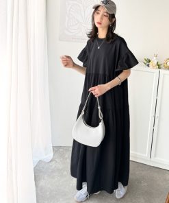 商品名:接触冷感♪夏 大活躍!涼しげフリルで夏の装い。布帛ドッキング袖フリルティアードオーバーサイズワンピース(ロング丈)