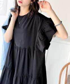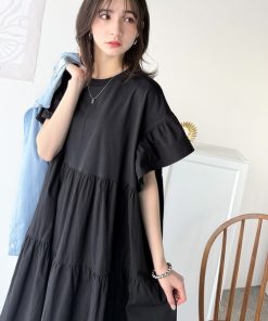 classicalelf ワンピース 接触冷感♪夏 大活躍!涼しげフリルで夏の装い。布帛ドッキング袖フリルティアードオーバーサイズワンピース(ロング丈)