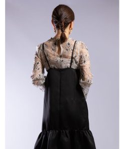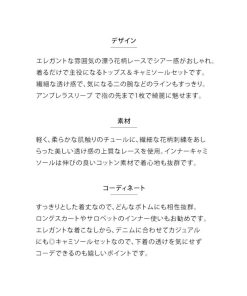 軽く、柔らかな肌触りのチュールに、繊細な花柄刺繍をあしらった美しい透け感の上質なレースを使用。