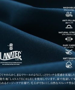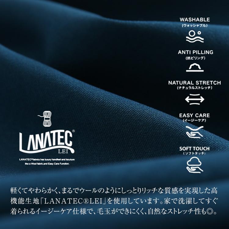 軽くてやわらかく、まるでウールのようにしっとりリッチな質感を実現した高機能生地「LANATEC(R)LEI」を使用しています。家で洗濯してすぐ着られるイージーケア仕様で、毛玉ができにくく、自然なストレッチ性も◎。