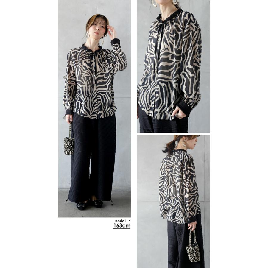 トップス ブラウス レディース ブラック 春 夏 秋 ゼブラ 長袖 薄手 シアー 軽い アニマル 柄 日除け 涼しい モノトーン フリル 大人可愛い 【カッコカワイイ】シアーゼブラ