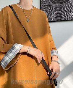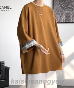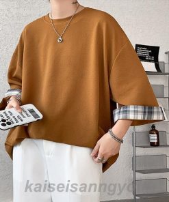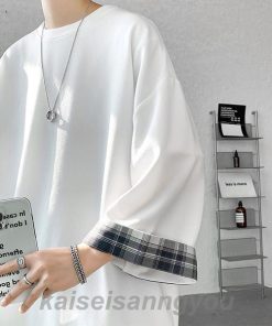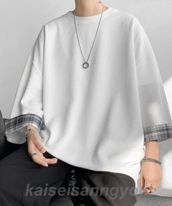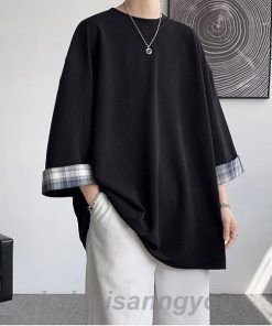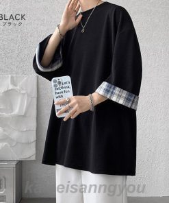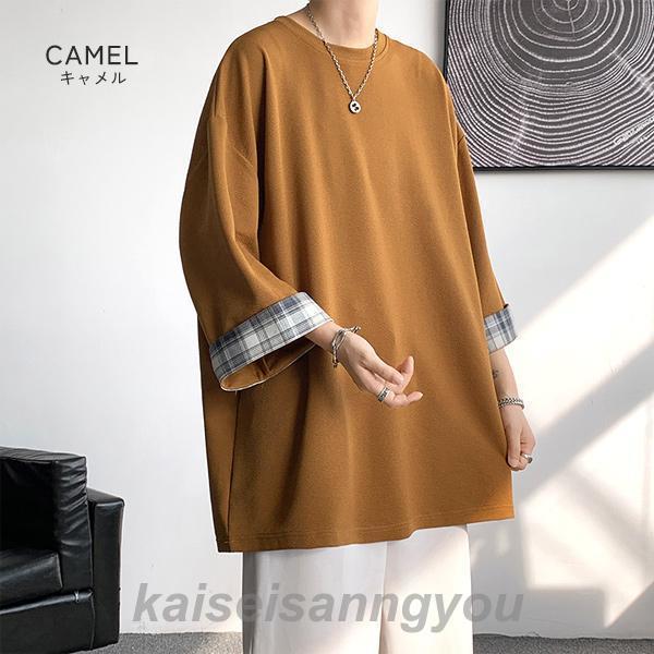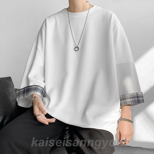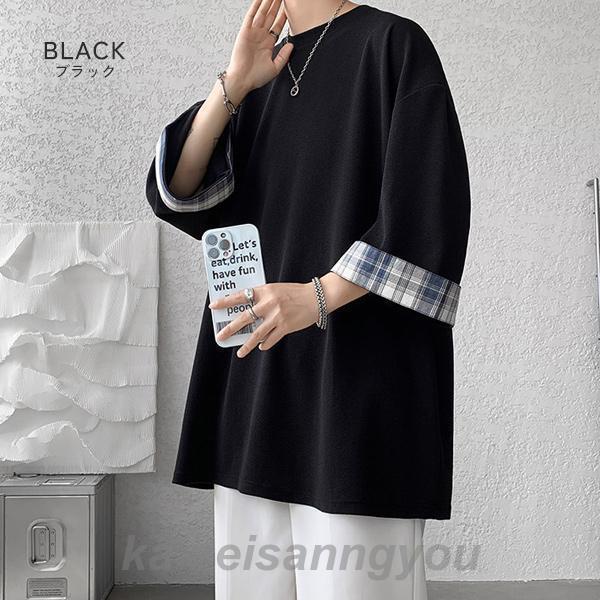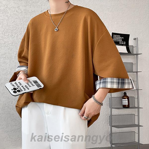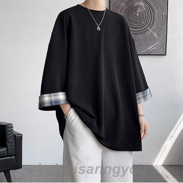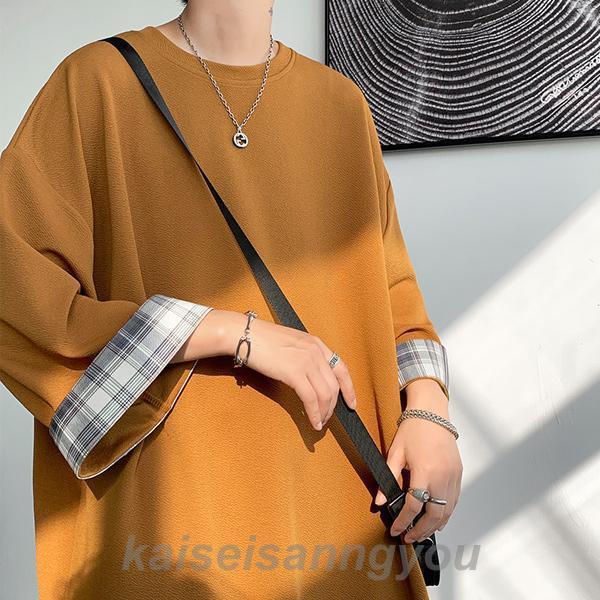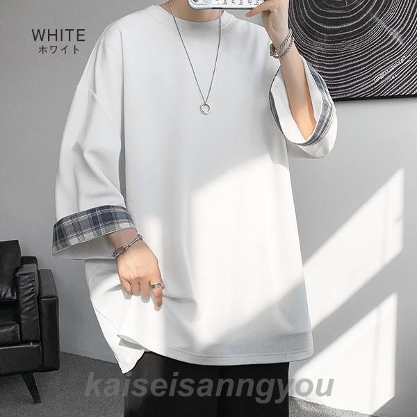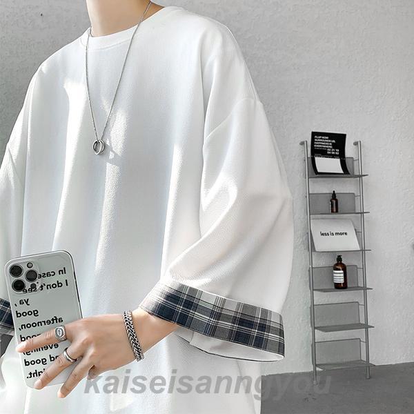 Tシャツ メンズ トップス 七分袖 半袖 ロング 長め ビッグシルエット 大きめ オーバーサイズ チェック柄 クルーネック 無地 お洒落 春 夏 秋
