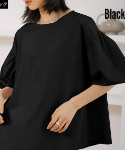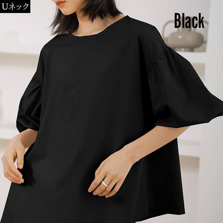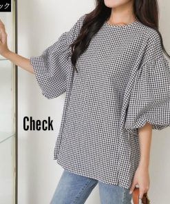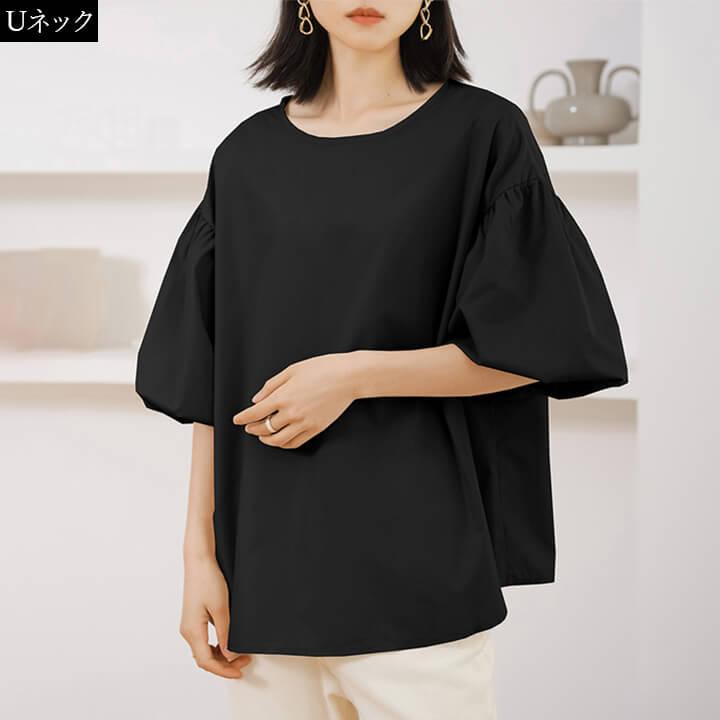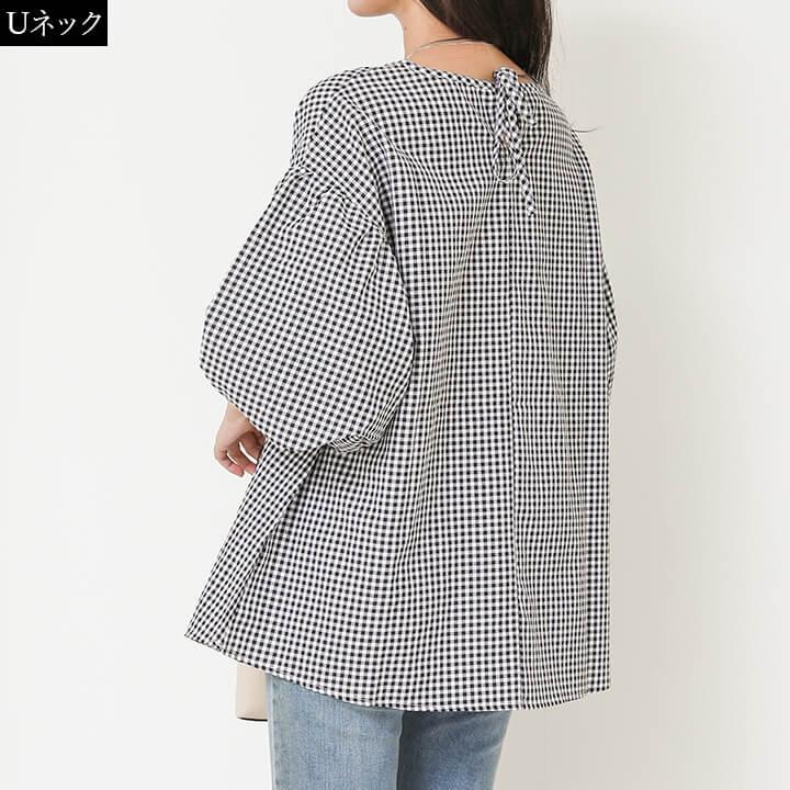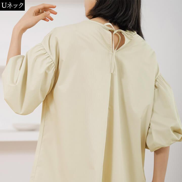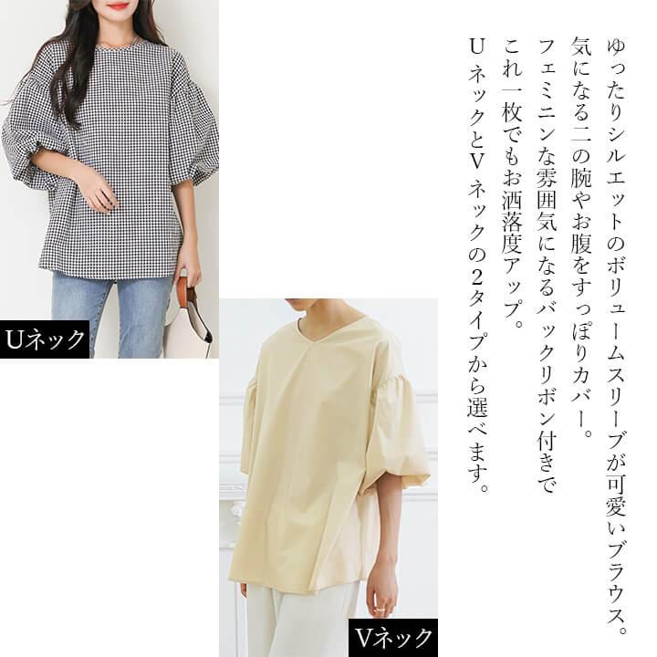 ブラウス レディース 半袖 カジュアル トップス リボン Uネック Vネック 大きめ ゆったり シルエット 華奢見え シンプル 無地 チェック 大人カジュアル 軽い かわいい 春 夏 着回し力 ミドル丈 大きいサイズ 綿 薄手 通気性 快適 涼しい 10代 20代 30代 40代 50代 60代 バックリボン 女性らしい おしゃれ 五分袖 二の腕カバー 2タイプ ベージュ 肌 ブラック 黒 チェック rt9295b