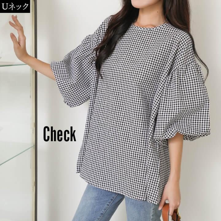 You Color ブラウス レディース 半袖 カジュアル トップス リボン Uネック Vネック 大きめ ゆったり シルエット 華奢見え シンプル 無地 チェック 大人カジュアル rt9295b